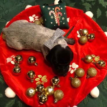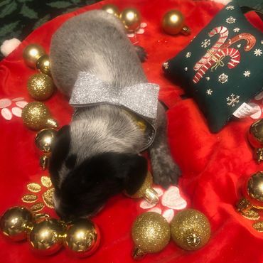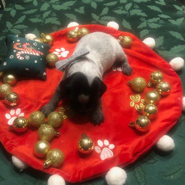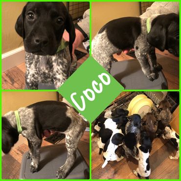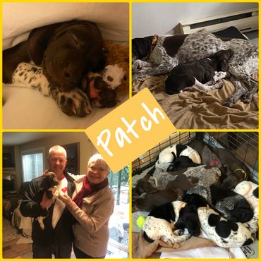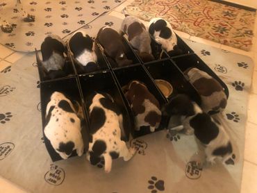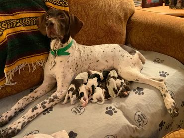 Zoey's first litter was born on December 9, 2021. She whelped 10 pups, three females and seven males. They varied in color from black and white patch to liver and white patch and black ticked to liver ticked. All 10 found amazing forever homes.